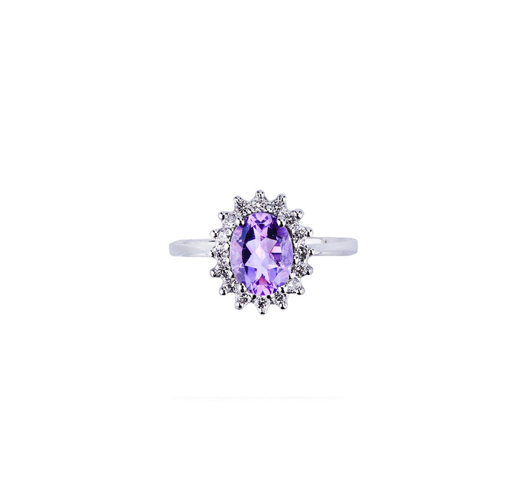 Anello ovali regolabile a forma di fiore, caratterizzati da un Ametista centrale fissato con quattro griffe e circondato da zirconi bianchi.